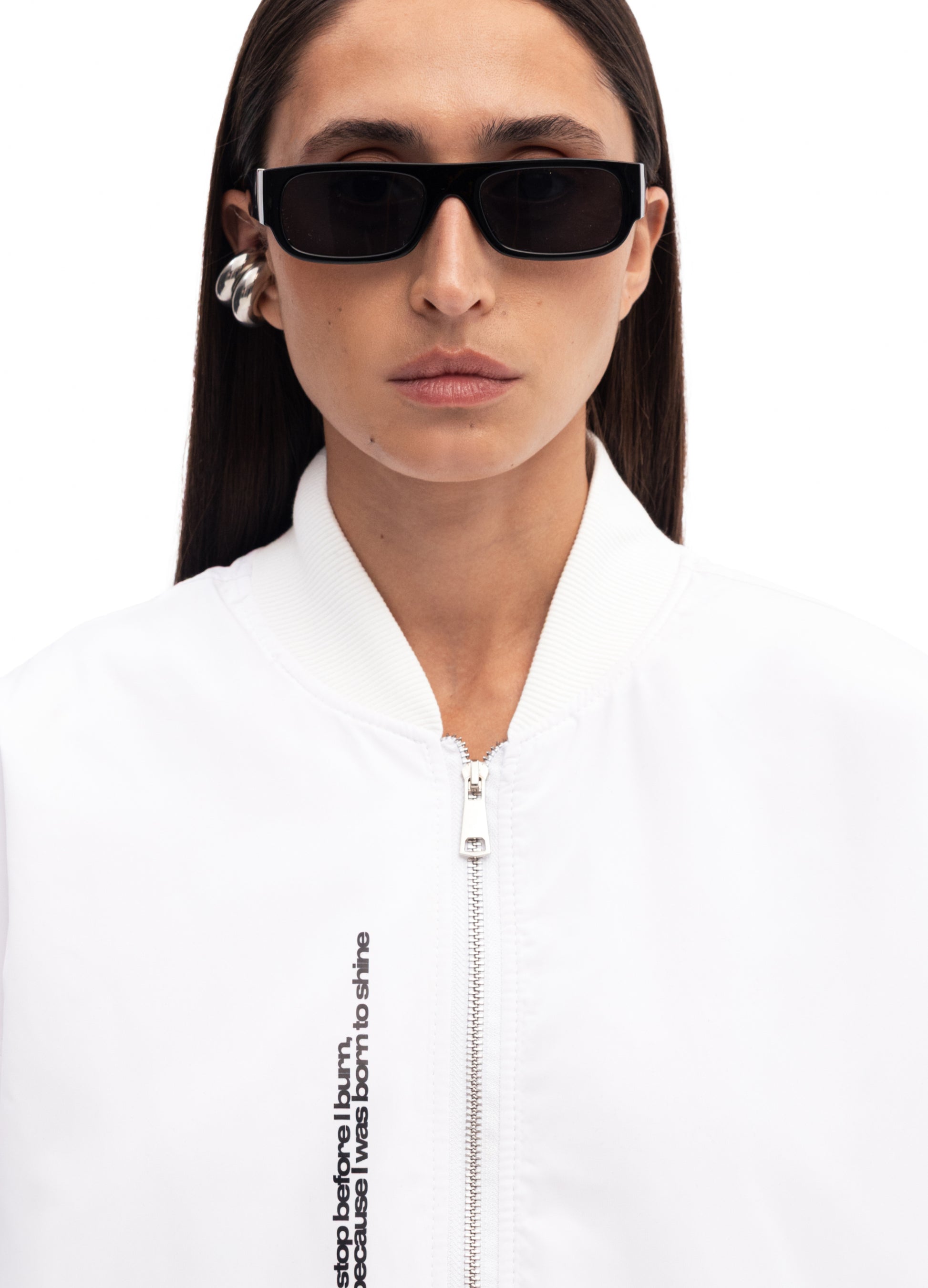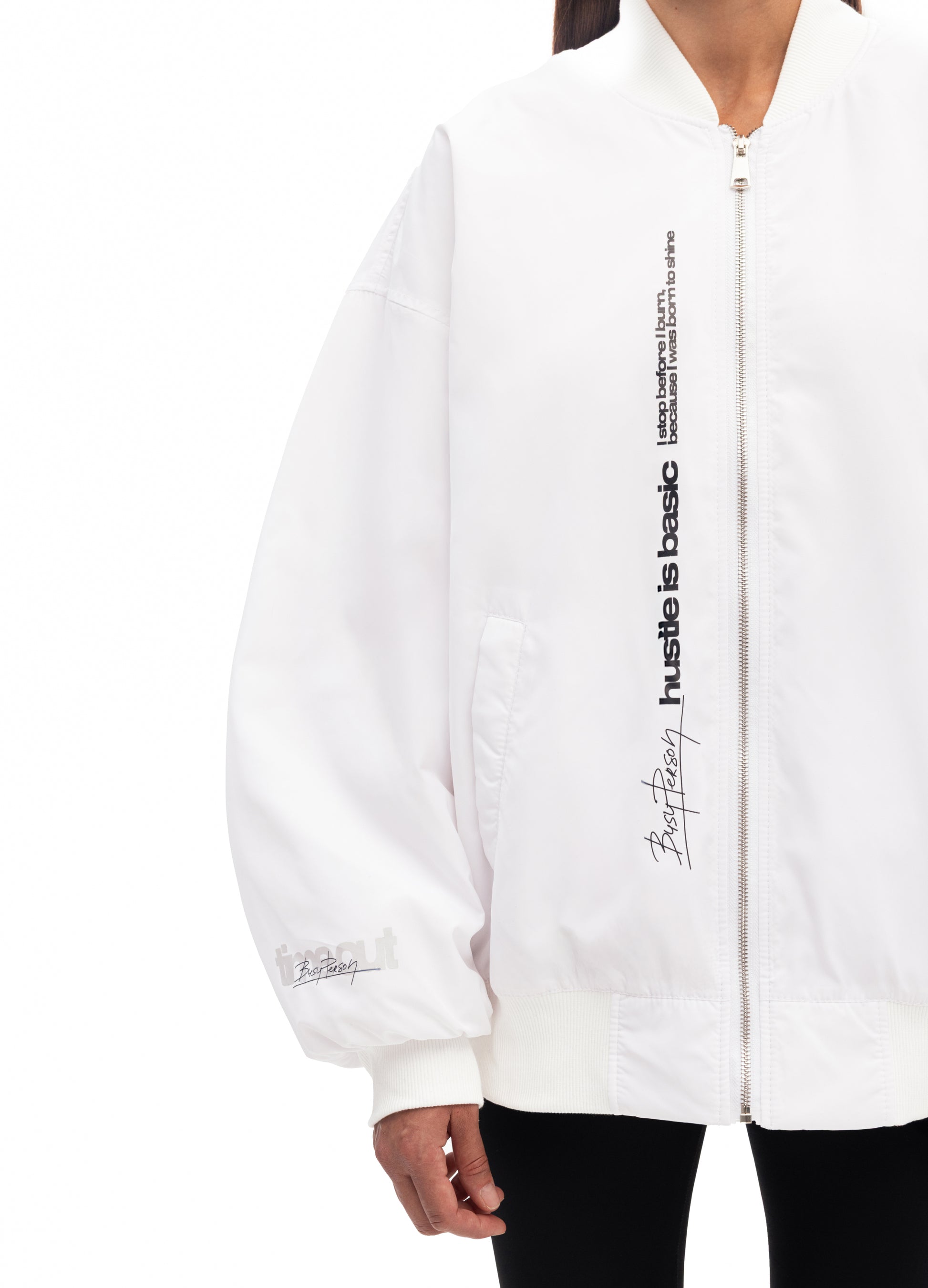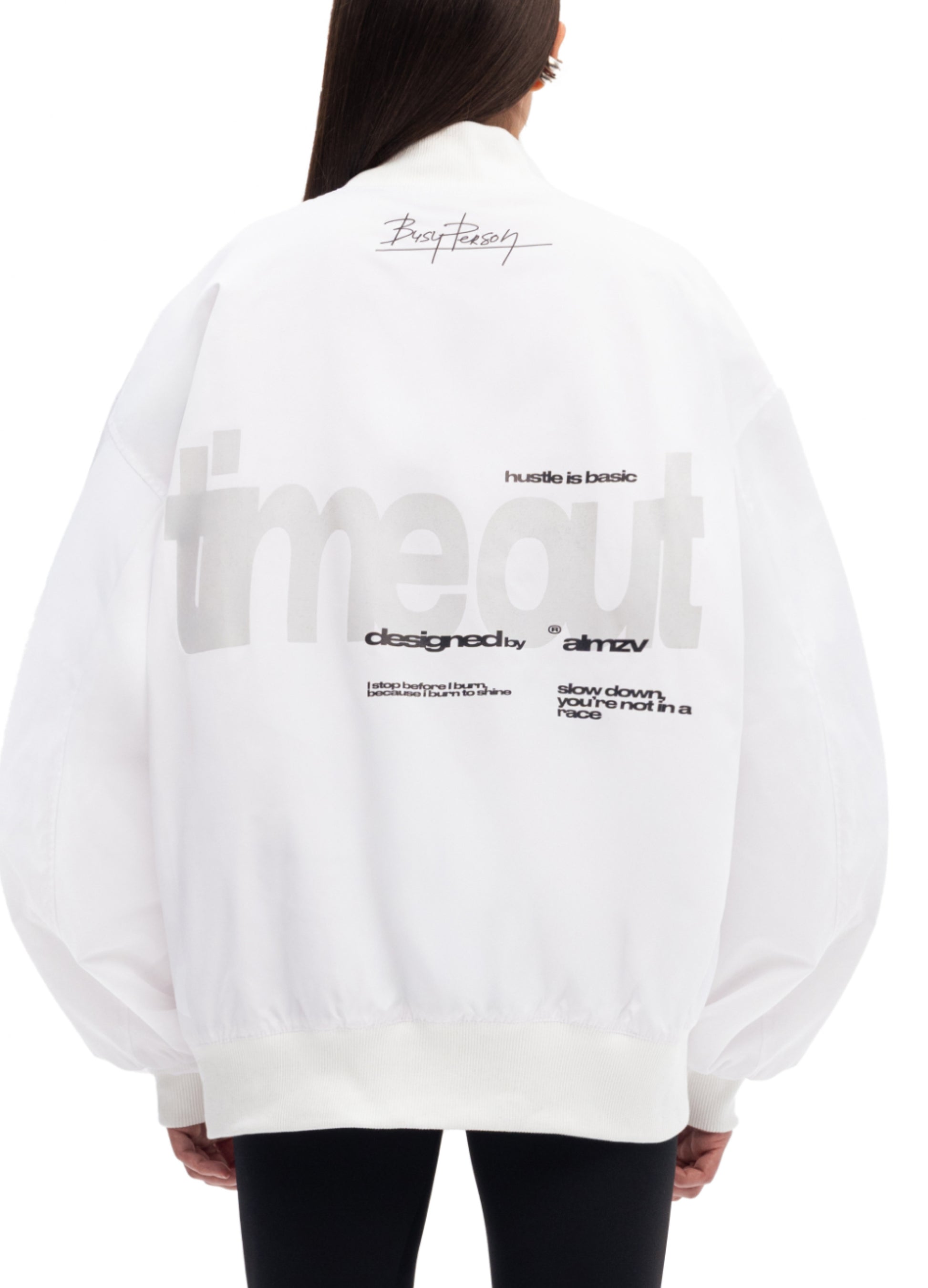Stylish oversize bomber.Features a minimalistic print in TIME OUT edition.