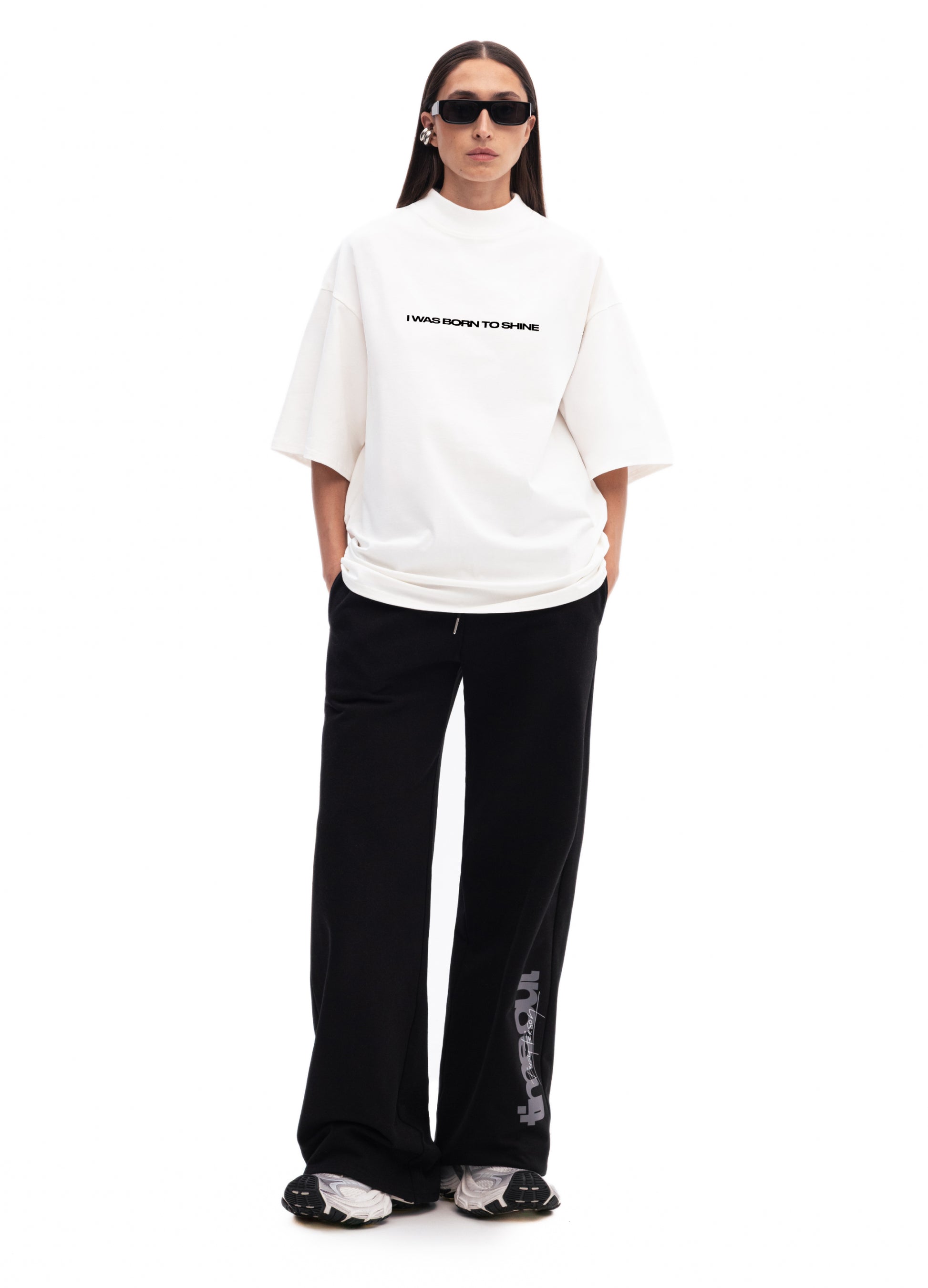 Oversized unisex t-shirt. Features a minimalistic print "I STOP BEFORE I BURN, BECAUSE I WAS BORN TO SHINE ".